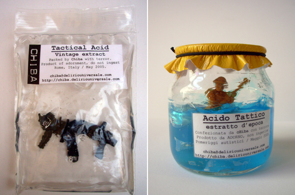 Chiba, Tactical Acid, old toys, jelly wax, 2004 ![]() Chiba, Lotte Intestine, mixed media, 2005 ![]() Chiba, Aria Fritta, mixed media, 2004 ![]() Chiba, Cervello in fuga, carni italiane, mixed media, 2004 ![]() Chiba, Rasato fresco, mixed media, cm 20x25, 2004 ![]() Chiba, 100gr di sorriso, mixed media, 2004 ![]() Chiba, Erba cattiva (non muore mai), mixed media, 2004 ![]() Chiba, Punti carisma, mixed media, 2004 |