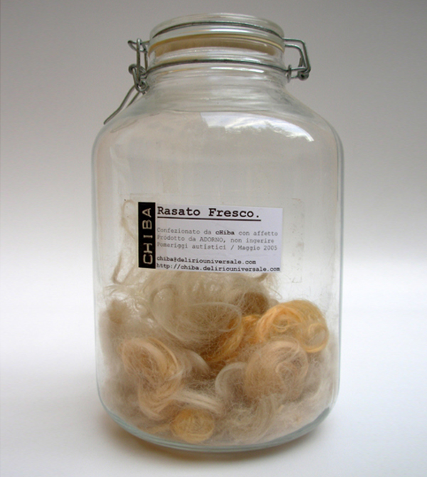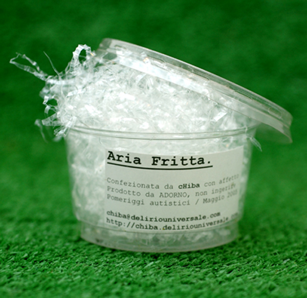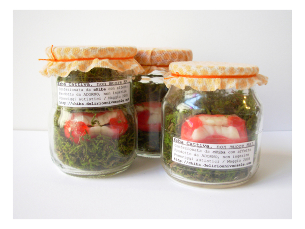 ![]() Chiba, Frigo, 2007, pic by Claudia Paijewski Plugins for fridge, Genetically Marvelled Organism. Ingredients: scotch-tape, toys, sponge, irony. Packed by Chiba with love, product of adornmet do not ingest. Forced, convulsive, creative, aesthetic, bulimic mixture of the nonsense of clichés. Desires, illusions, solutions, remedies for troubles, Fridge accessories. "If you are what you eat, sooner or later you will be digested".